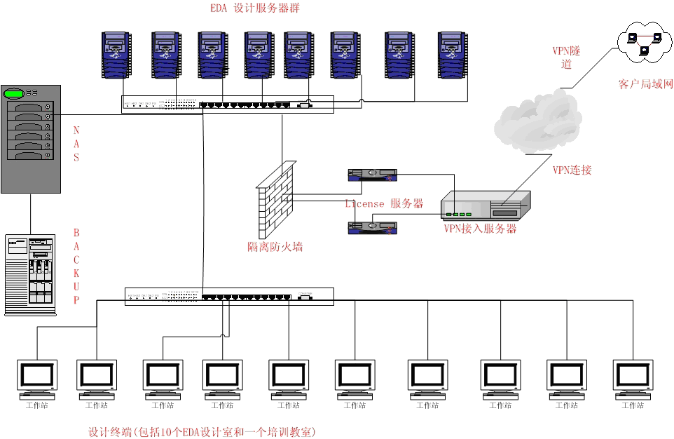 | 1、10个EDA工作机房:每个EDA机房配备两台Unix终端(根据客户需求,可以增加到4-15台),配备客户专用门禁系统,全天对外开放。 |
