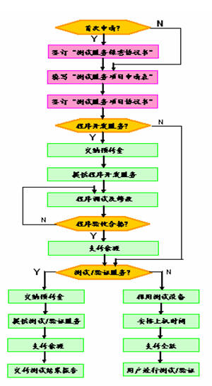 同时测试平台建立了规范的测试服务流程为企业进行测试服务,测试服务的申请流程如下: